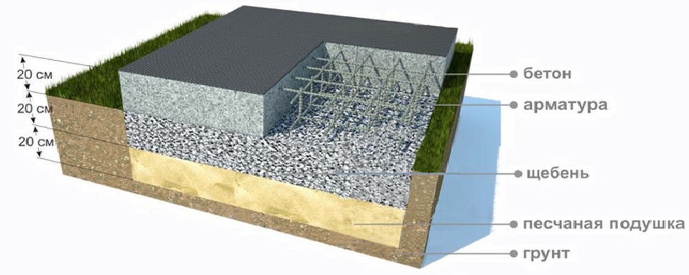 Особенностью фундамента является то, что он, в отличие от других типов, на глубину промерзания грунта не заглубляется. Перед заливкой бетонной смеси формируется основание из смеси песка с щебнем и тщательно утрамбовывается. На этом основании фундамент будто плавает, поэтому его еще называют «плавающей плитой».